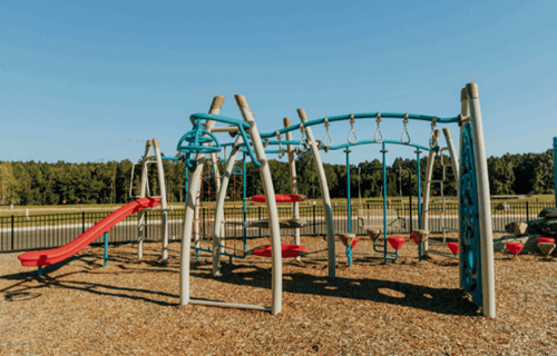 Head to the top of the rope ladder or down the slides. Test your balance on the pebble path or soar on the swings. It’s the perfect spot for kids (or kids at heart).